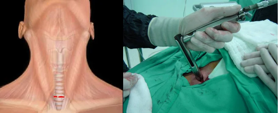 Is a surgical procedure used to examine the mediastinum, which is the central compartment of the chest located between the lungs. This procedure involves making a small incision at the base of the neck or above the breastbone to access the mediastinum.